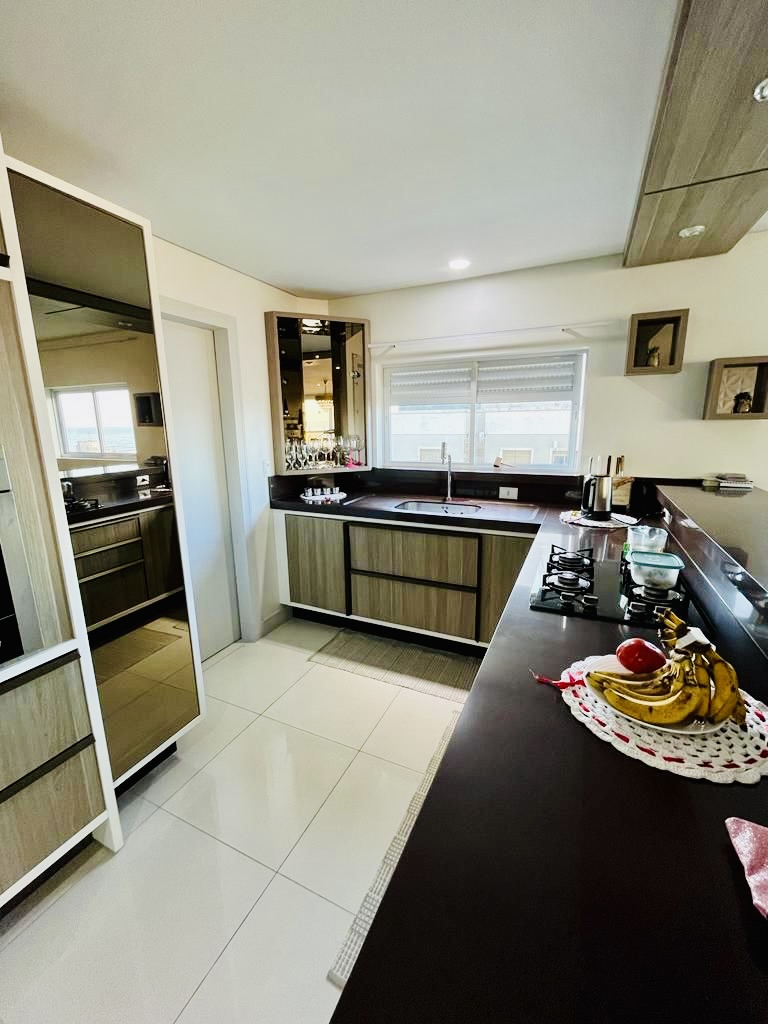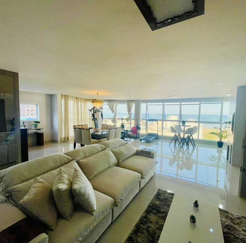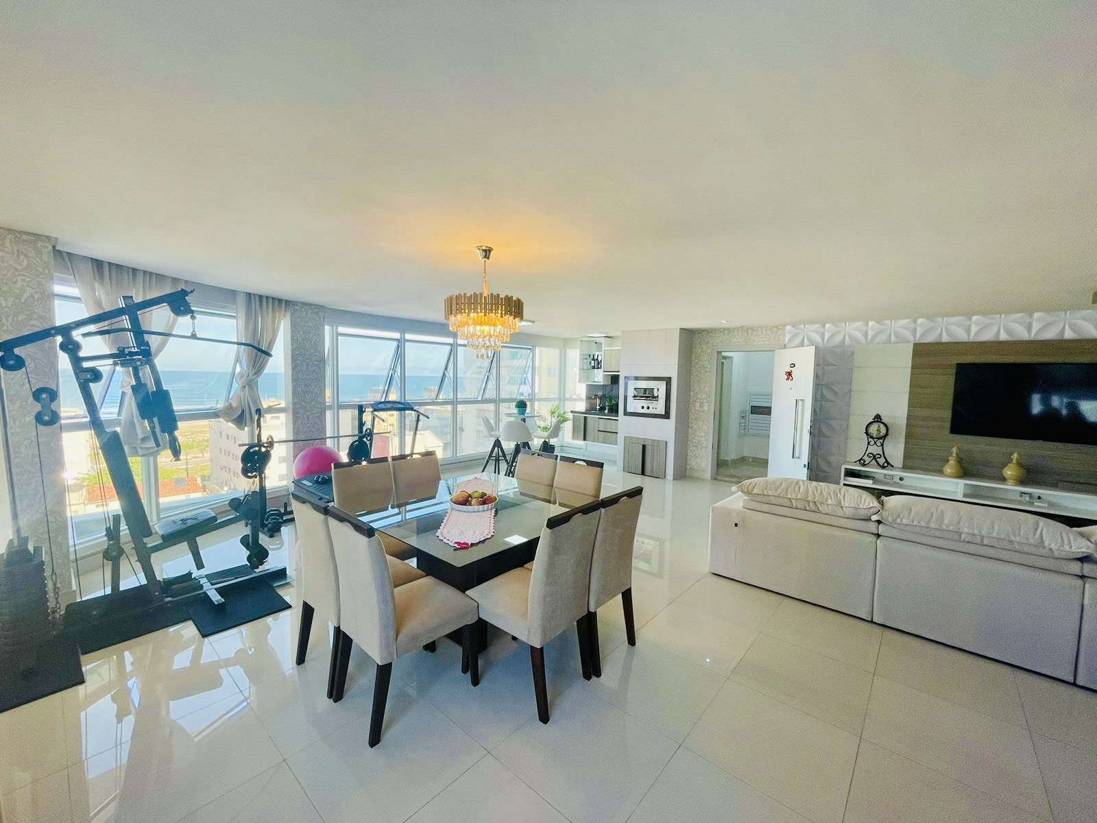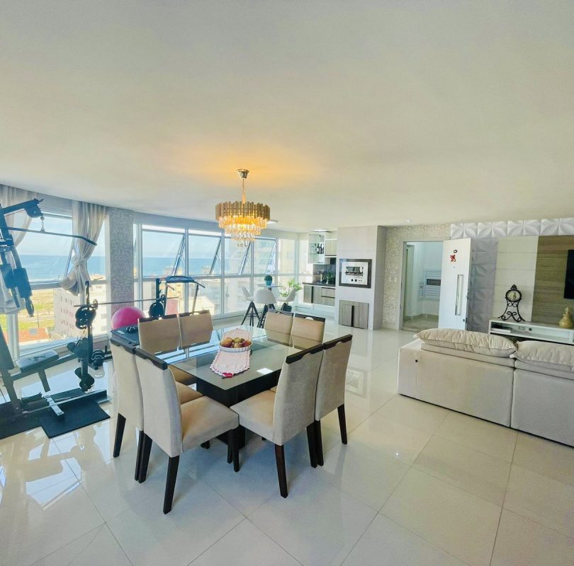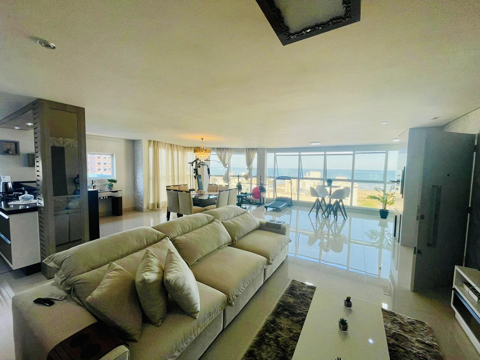 Sala conjugada com cozinha e sacada num espaço maravilhoso para curtir com a família e amigos, com vista para o mar.