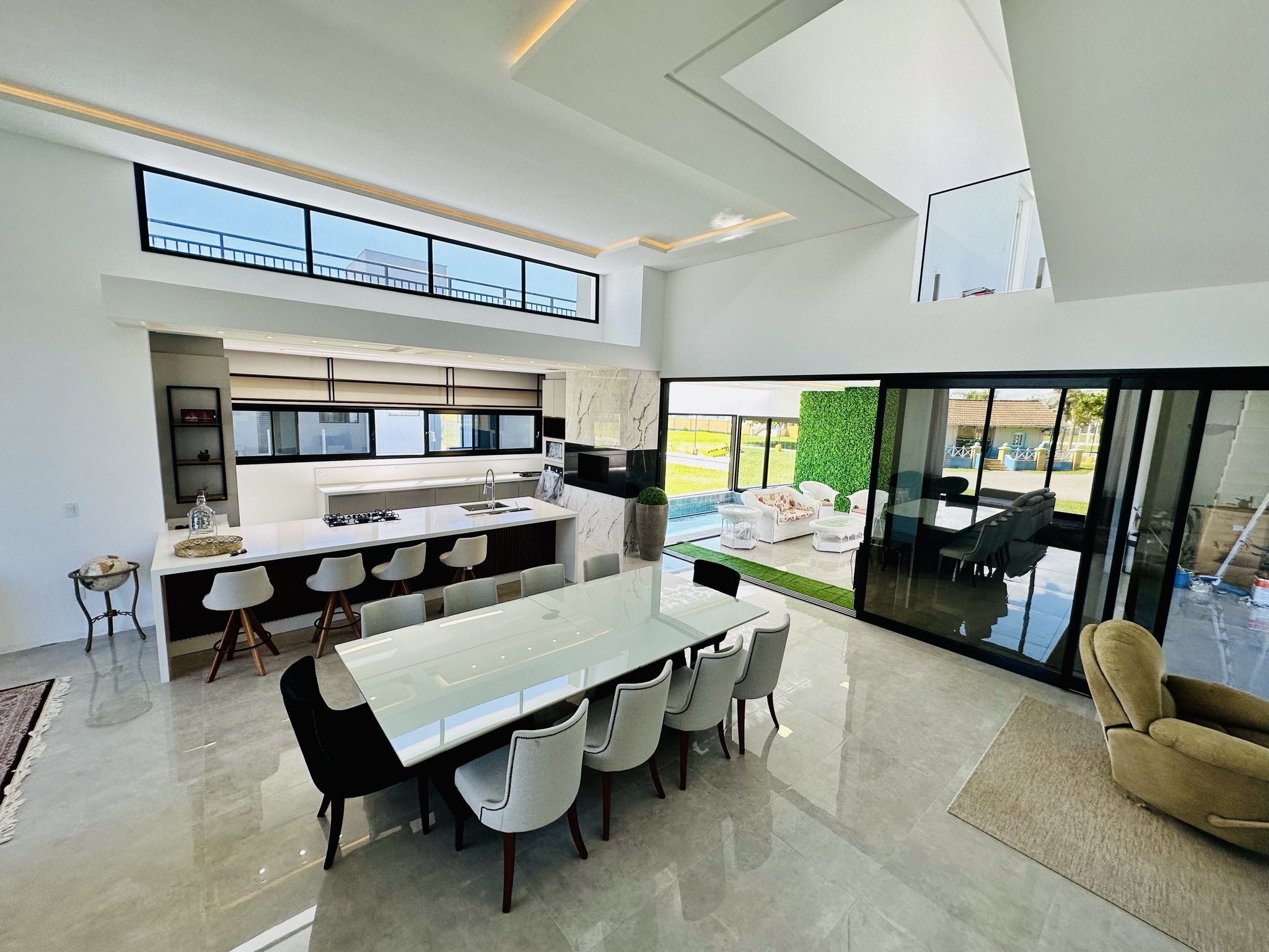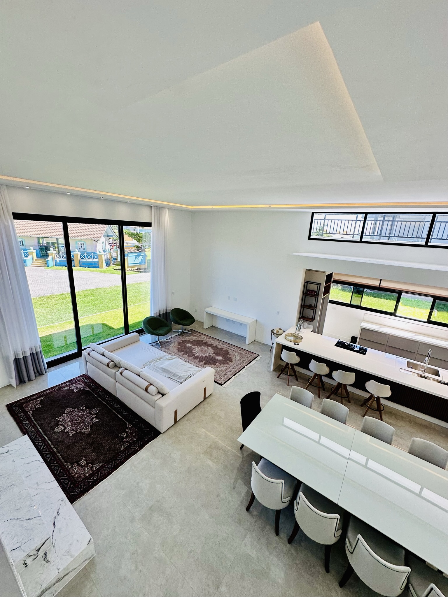 Sala de estar e de jantar conjugada com cozinha e piscina com pé-direito duplo
